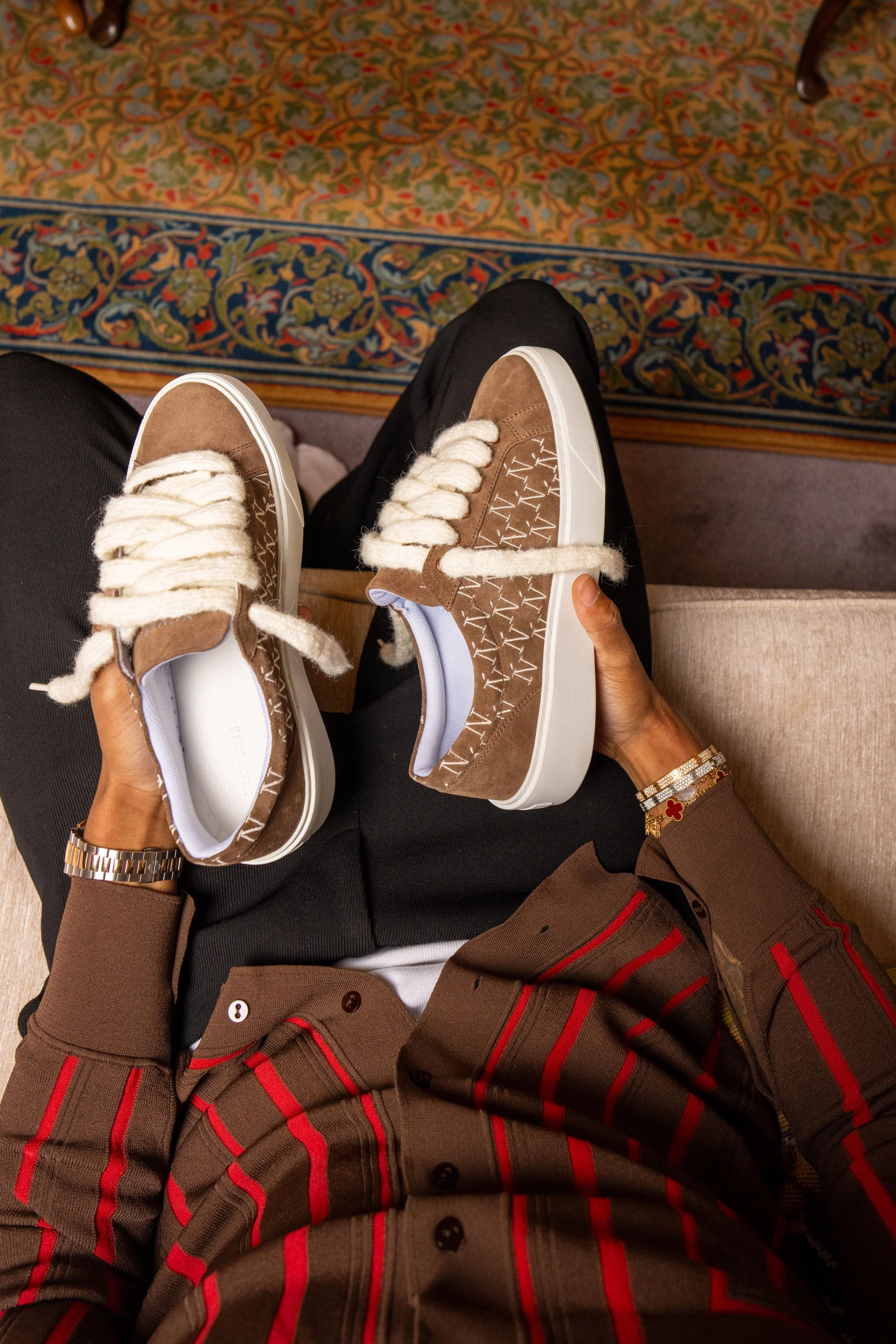 The Sigńet sneaker features Italian a light brown suede, 10mm mohair white laces and matching side panels which are accompanied by our sleek hand embroidered Ń monogram logo. The interior of the sneaker features white collar lining providing unrivalled comfort. The upper rests perfectly on top of our brand new complex rubber sole, exclusively made for Sigńet. Our distinct silver logo is positioned across the tongue.
