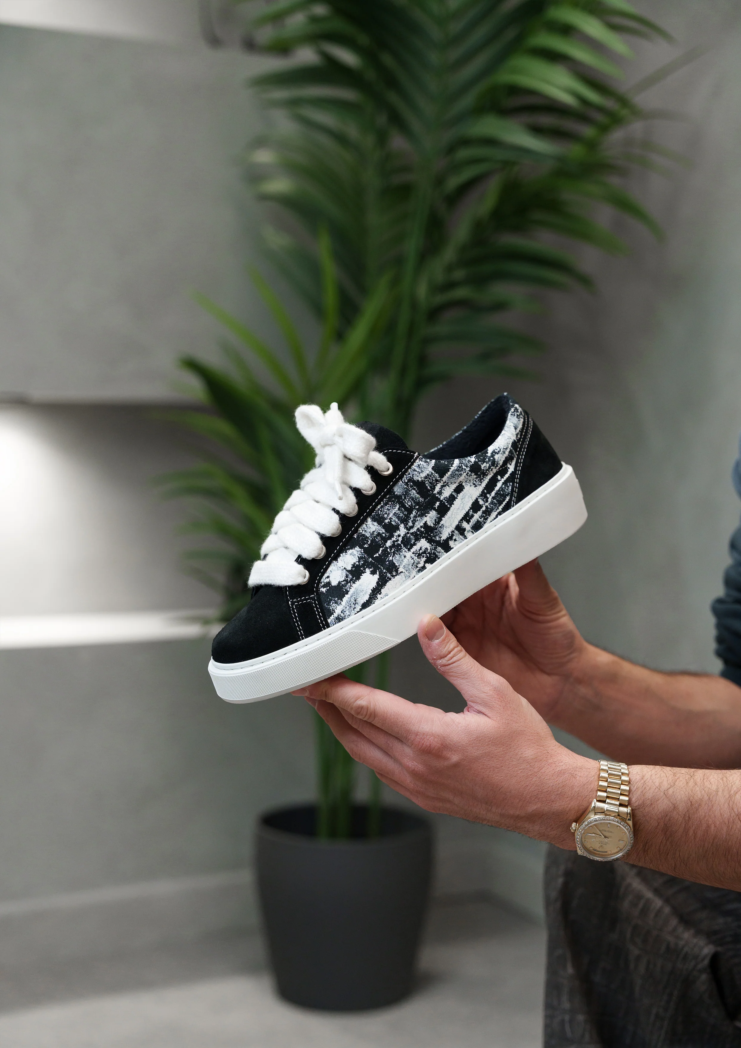 The Sigńet sneaker features Italian Black suede, matching side panels which are accompanied by a bespoke white paint pattern and 10mm mohair white laces. The interior of the sneaker features white teddy towel lining providing unrivalled comfort. The upper rests perfectly on top of our brand new complex rubber sole, exclusively made for Sigńet. Our distinct white logo is positioned across the tongue.