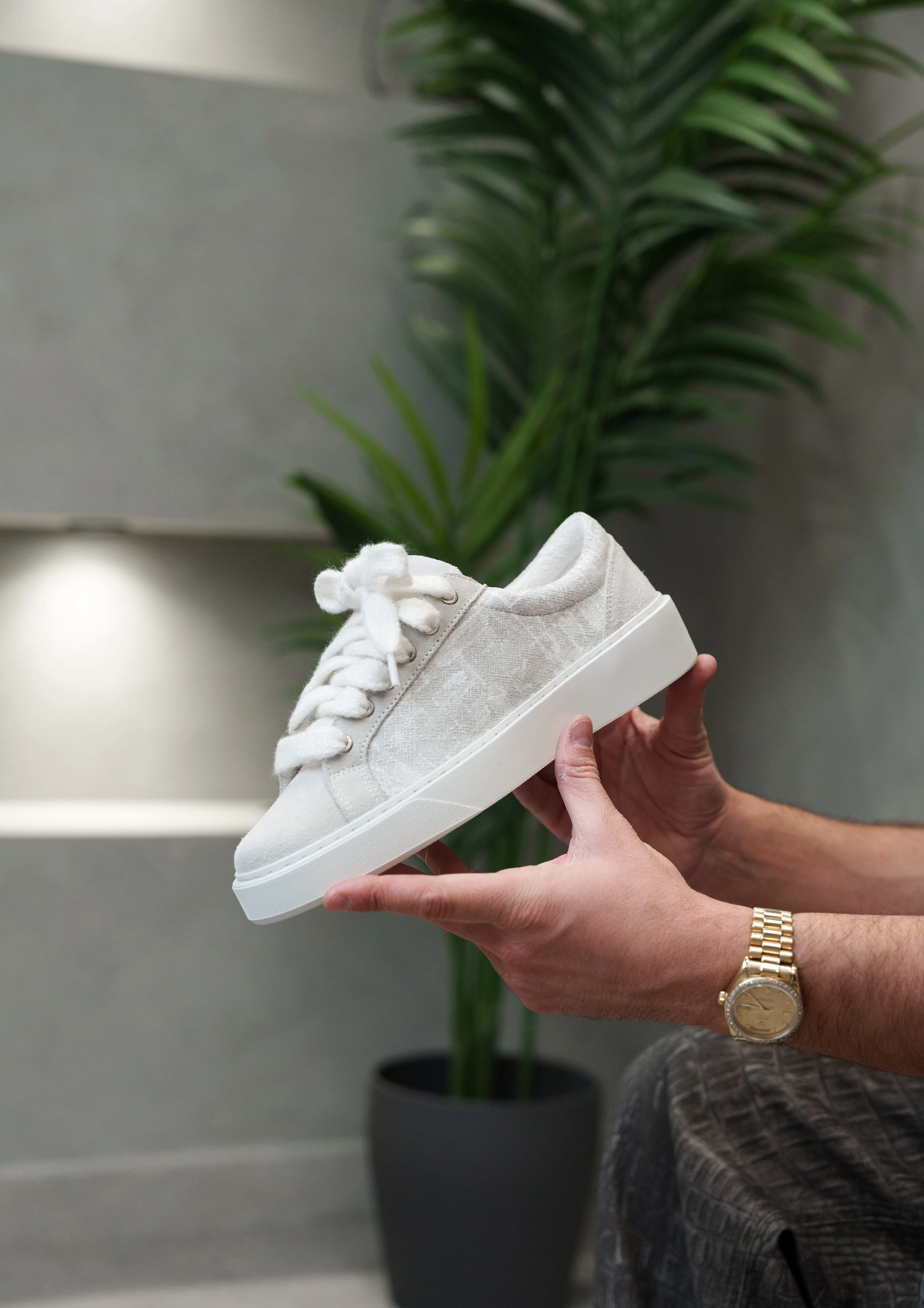 The Sigńet sneaker features Italian Grey suede, matching side panels which are accompanied by a bespoke white paint pattern and 10mm mohair white laces. The interior of the sneaker features white teddy towel lining providing unrivalled comfort. The upper rests perfectly on top of our brand new complex rubber sole, exclusively made for Sigńet. Our distinct white logo is positioned across the tongue.