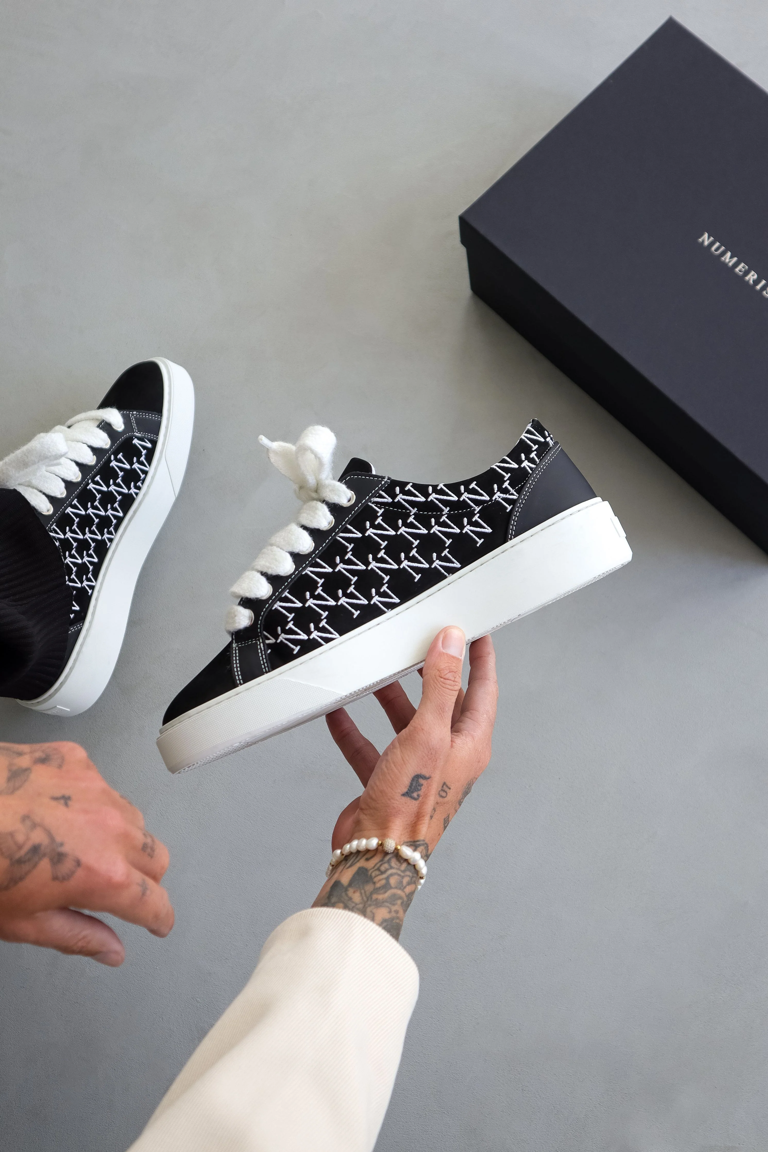 The Onyx colourway features Italian black nubuck, 10mm mohair white laces, black nubuck side panels and bespoke leather reinforced by TPU running down the eyestay. Which are accompanied by our sleek hand embroidered Ń monogram logo. The interior of the sneaker features black collar lining providing unrivalled comfort. The upper rests perfectly on top of our brand new complex rubber sole, exclusively made for Sigńet. Our distinct silver logo is positioned across the tongue.